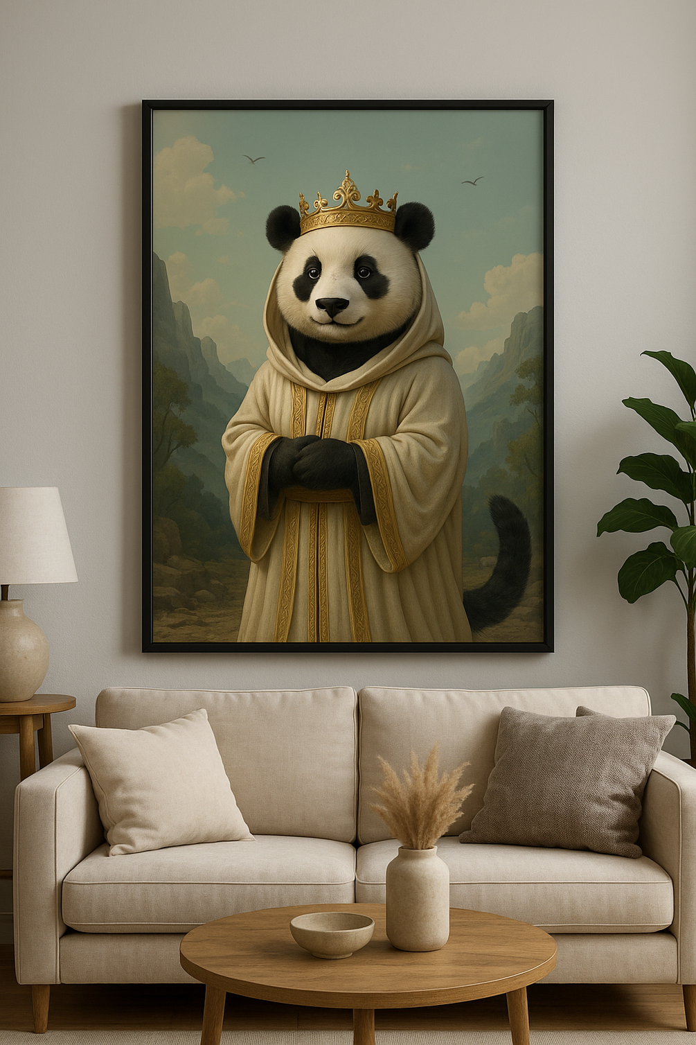 Bring a touch of whimsical royalty to your space with this high-quality digital artwork of a majestic panda dressed in golden robes and a crown. Perfect for living rooms, nurseries, or creative spaces, this piece combines charm and elegance in a fantasy-inspired setting. Download and print instantly for a magical statement piece on your wall.
