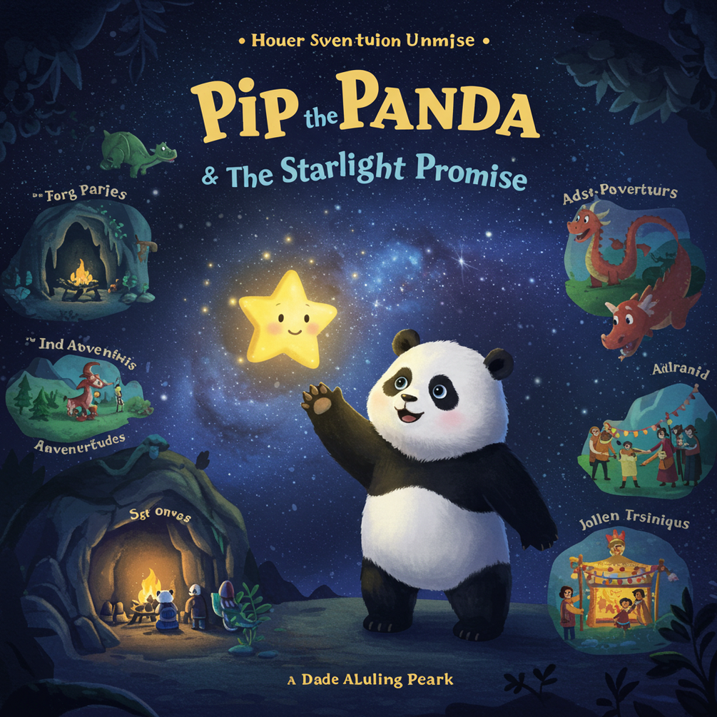 A tiny panda named Pip—too clumsy to climb bamboo—feels alone until a falling star grants his wish… and talks back! The star, Twinkle, needs Pip’s help to reach the mountaintop and return to the sky. Together, they brave grumpy moon bears, rainbow crystal caves, and a storm dragon (who’s just a scared baby!). Along the way, Pip learns that kindness (and silly dances!) can fix almost anything.